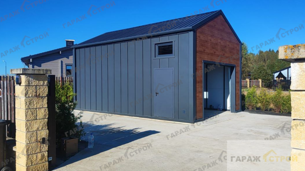 Гараж из сэндвич-панелей в стиле БарнХаус (barnhouse) — современное и функциональное решение для участка, когда важны и внешний вид, и практичность. Формат 8х5 м даёт комфортное место для автомобиля, мотоцикла или хозяйственного оборудования, а лаконичная архитектура БарнХаус аккуратно поддерживает эстетику загородного дома. Тёплый контур из сэндвич-панелей помогает использовать гараж круглый год: внутри проще поддерживать температуру и снижать риск конденсата при правильно организованной вентиляции. Основание на винтовых сваях со стяжкой пола подходит для быстрого старта работ и часто выручает на участках со сложными грунтами, а отделка фасадов и боковых стен делает объект визуально “дорогим”, не превращая его в капризную конструкцию по уходу. Компания «ГаражСтрой» выполняет строительство и монтаж под ключ: проектирование, прозрачная смета, договор и гарантия от производителя.