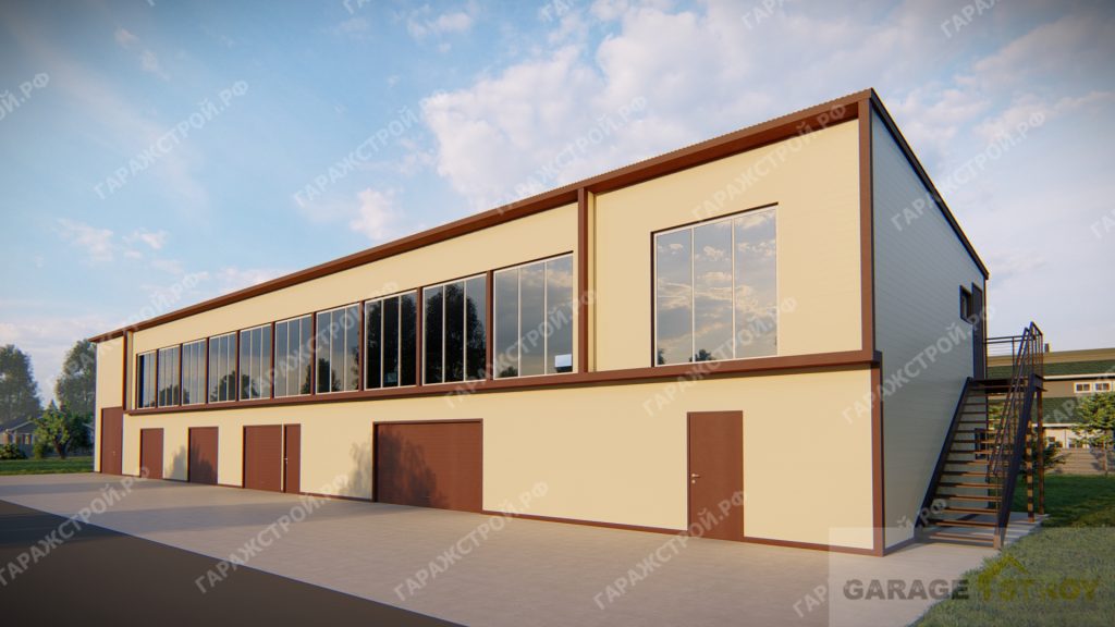 Двухэтажный дом комплекс 8х35м из сэндвич-панелей под ключ — решение, когда нужно быстро построить большой многофункциональный объект и “упаковать” несколько задач в одном здании. Такой дом-комплекс часто выбирают, когда первый этаж должен быть техническим (гаражные боксы, хранение, производство, сервис), а второй — комфортным и светлым пространством под офис, жильё персонала, комнату отдыха или зону ожидания. Каркасный контур на металлоконструкциях обеспечивает жёсткость и точную геометрию, а сэндвич-панели формируют энергоэффективный, герметичный периметр для круглогодичного использования: внутри проще держать температуру и снижать риск конденсата при правильно организованной вентиляции. Панорамное остекление второго этажа делает верхний уровень действительно пригодным для жизни и работы, а лестница и перекрытие обеспечивают понятную логистику и безопасное зонирование. Наличие подъёмных секционных ворот на первом уровне помогает удобно организовать въезды и поток техники. Компания «ГаражСтрой» выполняет строительство и монтаж под ключ: проектирование, прозрачная смета, договор, изготовление/производство комплекта, доставка и установка с гарантией от производителя.