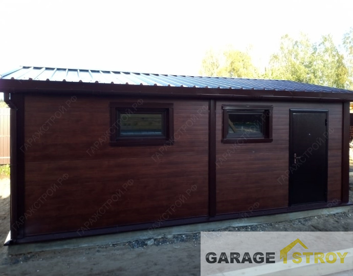 Каркасный гараж на 1 авто с отделкой под дерево — практичное решение, если нужно быстро построить тёплый каркасный гараж на 1 машину 7*5м и при этом сделать его визуально “домашним”, как имитация бруса / бревна. Такой формат хорошо смотрится на даче и рядом с домом: строение не выглядит технично, а поддерживает общий стиль участка, при этом остаётся удобным и функциональным. Каркасный контур на металлоконструкциях обеспечивает жёсткость и точную геометрию, а сэндвич-панели формируют энергоэффективный, герметичный периметр для круглогодичного использования: внутри проще поддерживать температуру, защищать помещение от продувания и снижать риск конденсата при правильно организованной вентиляции. Размер 6*5м даёт комфортное место под 1 автомобиль и хранение — стеллажи, резина, инструмент, садовые вещи, без тесноты и “перестановок”. Компания «ГаражСтрой» выполняет строительство и монтаж под ключ: проектирование, прозрачная смета, договор, изготовление/производство комплекта, доставка и установка с гарантией от производителя.