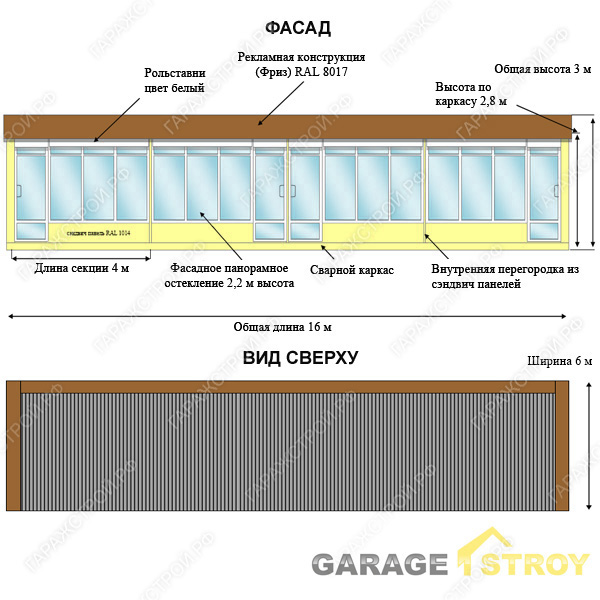 Торговый ряд из 4 павильонов 16×6 м из сэндвич-панелей под ключ — решение, если нужно быстро построить аккуратный коммерческий объект под аренду или собственную торговлю и запустить его без затяжного капитального строительства. Каркасный контур на металлическом каркасе обеспечивает жёсткость и точную геометрию здания, а стеновые и кровельные сэндвич-панели формируют тёплый, герметичный периметр для круглогодичного использования: внутри проще держать комфортную температуру и снижать риск конденсата при правильно организованной вентиляции. Формат торгового ряда удобен тем, что четыре павильона можно использовать независимо: разные арендаторы, разные товарные категории и режимы работы — без “пересечений” по доступу и входным группам. Монолитная железобетонная плита даёт стабильную базу и ровный пол, что важно для входных групп, витрин и долговечности отделки. Окна и двери ПВХ добавляют света и комфорт, а рольставни на окна повышают безопасность витрин. Доставка и монтаж по Московской области выполняются компанией «ГаражСтрой» — по смете и договору, с гарантийными обязательствами.